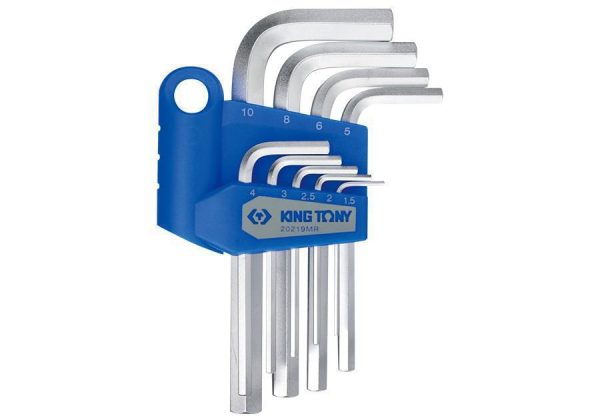 Το 20219MR της King Tony είναι ένα σετ 9 τεμαχίων από κλειδιά Άλεν (Hex Key Wrenches). Χαρακτηριστικά: Τύπος: Κλειδιά Άλεν (Hex Key Wrenches) Υλικό: Κράμα χάλυβα SNCM-V Φινίρισμα: Χρωμιωμένο Περιεχόμενο: 9 Κλειδιά Άλεν σε μεγέθη: 1.5 – 10mm (H1.5 , H2 , H2.5 , H3 , H4 , H5 , H6 , H8 , H10) Εφαρμογές: Ιδανικό για σφίξιμο και χαλάρωση βιδών με εξαγωνική υποδοχή που απαντώνται συνήθως σε έπιπλα, μηχανήματα και άλλες εφαρμογές. Πλεονεκτήματα: Κατασκευασμένα από κράμα χάλυβα SNCM-V υψηλής ποιότητας για αντοχή και μακροζωία. Φινίρισμα χρωμίου για αντοχή στη διάβρωση. Περιλαμβάνει τα πιο συνηθισμένα μεγέθη (1.5 – 10mm) για ευελιξία σε διάφορες εργασίες (επιβεβαίωση πληροφοριών). Συμπαγής σχεδιασμός για εύκολη αποθήκευση και μεταφορά. Κατάλληλο για επαγγελματική και ερασιτεχνική χρήση. Συνολικά: Το King Tony 20219MR είναι ένα ευέλικτο σετ κλειδιών Άλεν κατάλληλο για διάφορες εργασίες. Κατασκευασμένο από ανθεκτικά υλικά με προστατευτικό φινίρισμα, αυτό το σετ αποτελεί μια πολύτιμη προσθήκη σε κάθε εργαλειοθήκη.
