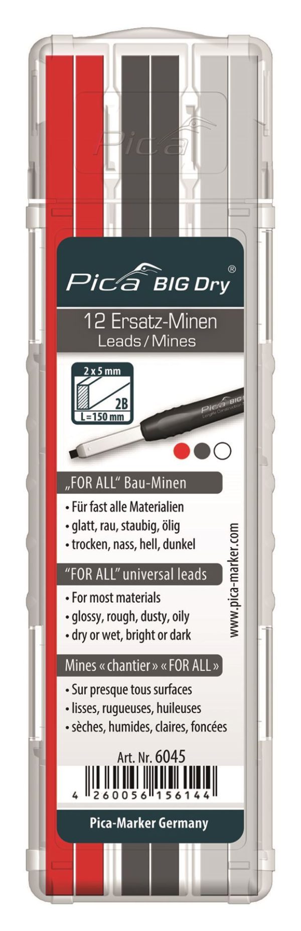 Μύτες – ανταλλακτικά Pica Big Dry Refill Leads 6045. Κατάλληλα για το Pica Big Dry. Κουτί με 12 μύτες – 4 Graphite 2B, 4 Κόκκινες και 4 Λευκές.