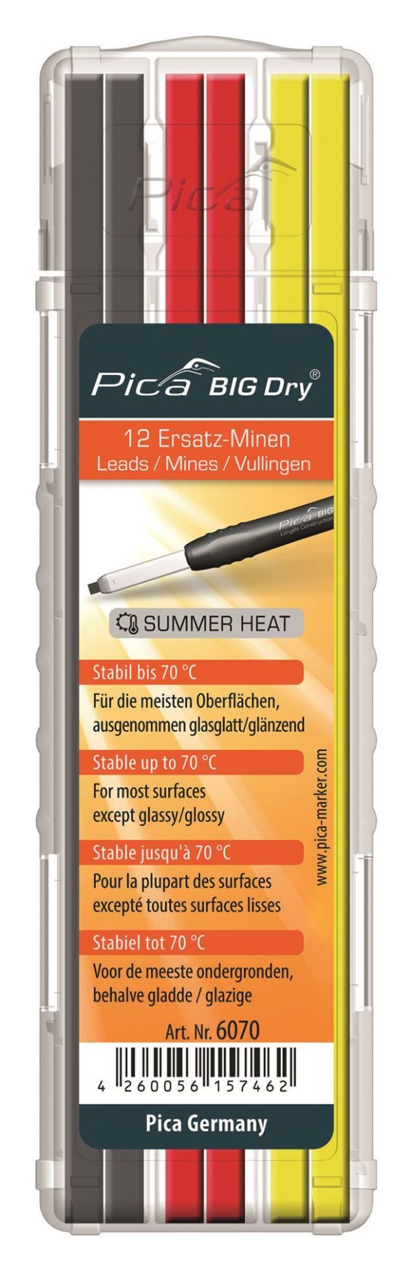 Μύτες – ανταλλακτικά Pica Big Dry Summer Leads. Κατάλληλα για το Pica Big Dry. Ανθεκτικές σε θερμοκρασία έως 70 Βαθμούς Κελσίου. Κουτί με 12 ειδικές μύτες ( 4 Graphite for all 2B + 4 κόκκινες + 4 κίτρινες)