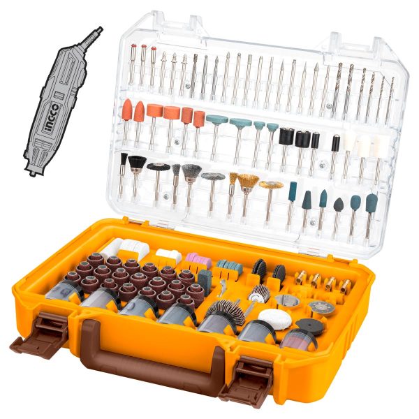 Περιεχόμενα συσκευασίας 40 τεμ Δακτύλιοι λείανσης, 7 τεμ Δίσκοι τσόχας, 2 τεμ Μυτερή τσόχα, 1 τεμ Υφασμάτινος τροχός, 4 τεμ Τροχoί στίλβωσης από καουτσούκ, 6 τεμ Τρυπανάκια, 3 τεμ Φρέζες κοπής, 1 τεμ Διαμαντόδισκος κοπής, 1 τεμ Δίσκος κοπής, 3 τεμ Εξάρτημα για τροχό λείανσης, 10 τεμ Μεγάλες ακίδες λείανσης, 10 τεμ Κεφαλή λείανσης με διαμάντι, 9 τεμ Κεφαλές λείανσης, 9 τεμ Βούρτσες, 4 τεμ Τσοκ, 6 τεμ Δίσκοι κοπής, 1 τεμ Τροχός λείανσης, 18 τεμ Δίσκοι κοπής, 1 τεμ Πέτρα ακονίσματος, 2 τεμ Δίσκοι λείανσης φίμπερ, 1 τεμ Κλειδί, 120 τεμ Δίσκοι λέιανσης, 157 τεμ Γυαλόχαρτα, 1 τεμ Πάστα, 3 τεμ Οδηγοί εξρτημάτων, Πλαστική θήκη.