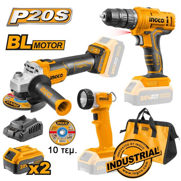 Λεπτομέρειες προϊόντος 1. Δραπανοκατσάβιδο Μπαταρίας: Ταχύτητα 0-400/0-1500rpm, Ροπή 45Nm, Ρυθμίσεις ροπής 15+1, Υποδοχή τσοκ 0.8-10mm, Led λάμπα εργασίας, Βάρος: 1.00kg. 2. Γωνιακός Τροχός Μπαταρίας: Ταχύτητα κοπής 8500rpm, Ταχύτητα λείανσης 3000rpm, Διάμετρος δίσκου Φ 115mm, Άξονας M14, Brushless Motor (μοτέρ χωρίς καρβουνάκια), Βάρος: 1.20kg. 3. Φακός Προβολέας Μπαταρίας: Ισχύς 1.5W, Φωτεινή ροή (φωτεινότητα) 150±10% lumen, Κεφαλή πολλαπλών θέσεων, Βάρος: 0.80kg.