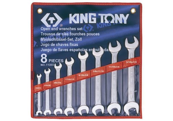Το King Tony 1108SR είναι ένα σετ 8 γερμανικών κλειδιών ίντσας. Χαρακτηριστικά προϊόντος: Τύπος: Σετ γερμανικών κλειδιών ίντσας Αριθμός τεμαχίων: 8 Μεγέθη: 1/4″ x 5/16″ 5/16″ x 3/8″ 3/8″ x 7/16″ 7/16″ x 1/2″ 9/16″ x 5/8″ 5/8″ x 11/16″ 11/16″ x 3/4″ 13/16″ x 7/8″ Υλικό: Χάλυβας χρωμίου-μολυβδαινίου (Cr-Mo) για αντοχή και διάρκεια. Βάρος: 0,91 kg Εφαρμογές: Σφίξιμο και χαλάρωμα παξιμαδιών και βιδών με εξαγωνικές κεφαλές σε ίντσες Ιδανικό για χρήση σε διάφορες εφαρμογές όπου χρησιμοποιούνται μονάδες ίντσας, όπως συναρμολόγηση επίπλων, επισκευές αυτοκινήτων και εργασίες γενικής συντήρησης. Πλεονεκτήματα: Παρέχει μια ποικιλία μεγεθών κλειδιών για να χειριστείτε διαφορετικές διαστάσεις παξιμαδιών και βιδών σε ίντσες. Ο ανοιχτός σχεδιασμός επιτρέπει ευκολότερη πρόσβαση σε παξιμάδια και βίδες σε στενούς χώρους σε σύγκριση με άλλους τύπους κλειδιών. Συμπαγές και φορητό σετ για εύκολη αποθήκευση και μεταφορά. Κατασκευασμένο από χάλυβα χρωμίου-μολυβδαινίου για αντοχή και διάρκεια.