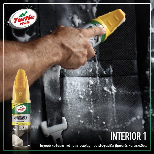 Καθαριστικό ταπετσαρίας σε aerosol με ειδική βούρτσα 400ml, TURTLE WAX. Το Interior 1 είναι ένα ισχυρό καθαριστικό ταπετσαρίας που εξαφανίζει βρωμιές και λεκέδες από όλα τα υφάσματα, ταπετσαρίες και βινύλια. Απορροφά και εξουδετερώνει διαπαντός τις οσμές.