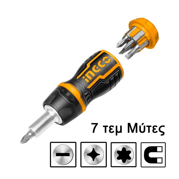 Περιεχόμενα συσκευασίας 1 τεμ. Λαβή καστάνιας (με αποθηκευτικό χώρο μέσα). 7 τεμ. Μύτες 25mm: SL5, SL6, PH0, PH1, PH2, T10, T20. (Το Stand περιέχει 12τεμ.)