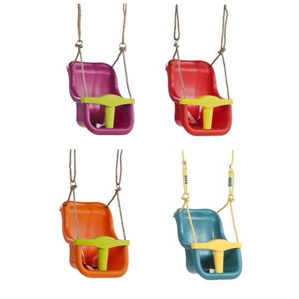 Η μπάρα T διαθέτει 3 σημεία πρόσδεσης που προσθέτουν επιπλέον ασφάλεια. Το τιρκουάζ παιδικό κάθισμα έχει κίτρινο σχοινί PP με τιρκουάζ συγκολλήσεις ενώ τα άλλα χρώματα έχουν σχοινί σε φυσικό χρώμα με μαύρες συγκολλήσεις PP.