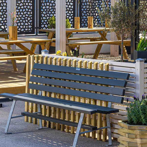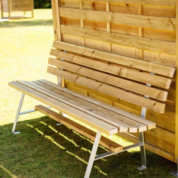 Ξύλινο παγκάκι με μεταλλικά πόδια που βιδώνονται στο έδαφος.