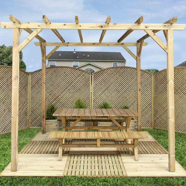 Η ξυλεία που χρησιμοποιείται για την κατασκευή της ξύλινης πέργκολας είναι πλανισμένη και εμποτισμένη ξυλεία Πεύκης (εμποτισμένη σε κενό υπό πίεση), Φινλανδικής προέλευσης.