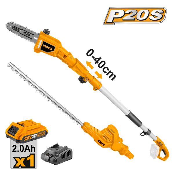 Λεπτομέρειες προϊόντος 1. Αλυσοπρίονο (PSLI20081): Ταχύτητα αλυσίδας 4.8m/s, Μέγεθος λάμας 8" / 200mm, Τέντωμα αλυσίδας, Αυτόματη λίπανση, Χωρητικότητα δεξαμενής 70ml. Βάρος μαζι με μπαταρία και κοντάρι: 4.50 kg 2. Μπορντουροψάλιδο (CPHT2016012): Tαχύτητα χωρίς φορτίο 2800rpm, Μήκος λάμας 18" / 450mm, Δυνατότητα κοπής έως 18mm. 7 Θέσεις περιστροφικής κεφαλής έως και 90 μοιρών. Μαχαίρια από ειδικό ατσάλι κομμένα με Laser και τροχισμένα με διαμάντι. Βάρος μαζι με μπαταρία και κοντάρι: 5.50 kg Τηλεσκοπικό κοντάρι με συνολικό ολικό μήκος 1.96m. Τηλεσκοπική προέκταση +40cm