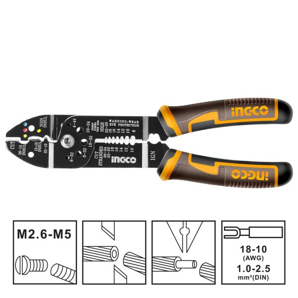 Λεπτομέρειες προϊόντος Άκρες κοφτερές για κόψιμο καλωδίων. Λειτουργία πρεσαρίσματος και απογύμνωσης καλωδίων. Κατάλληλος για σύρματα χαλκού και αλουμινίου. 7 Θέσεις απογύμνωσης καλωδίων. 5 θέσεις κόψιματος χαλκού.