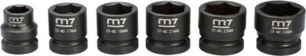 Σετ Εξάγωνα καρυδάκια αέρος της εταιρείας M7 με καρέ υποδοχής 1/2″, κατασκευασμένα από επισκληρυμένο μέταλλο και ανθεκτικό σε δονήσεις ή κρούσεις κατά την εργασία.